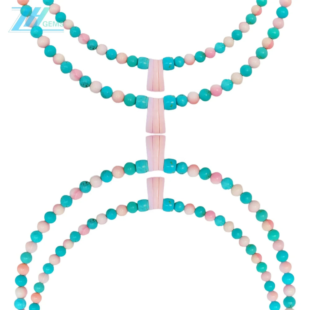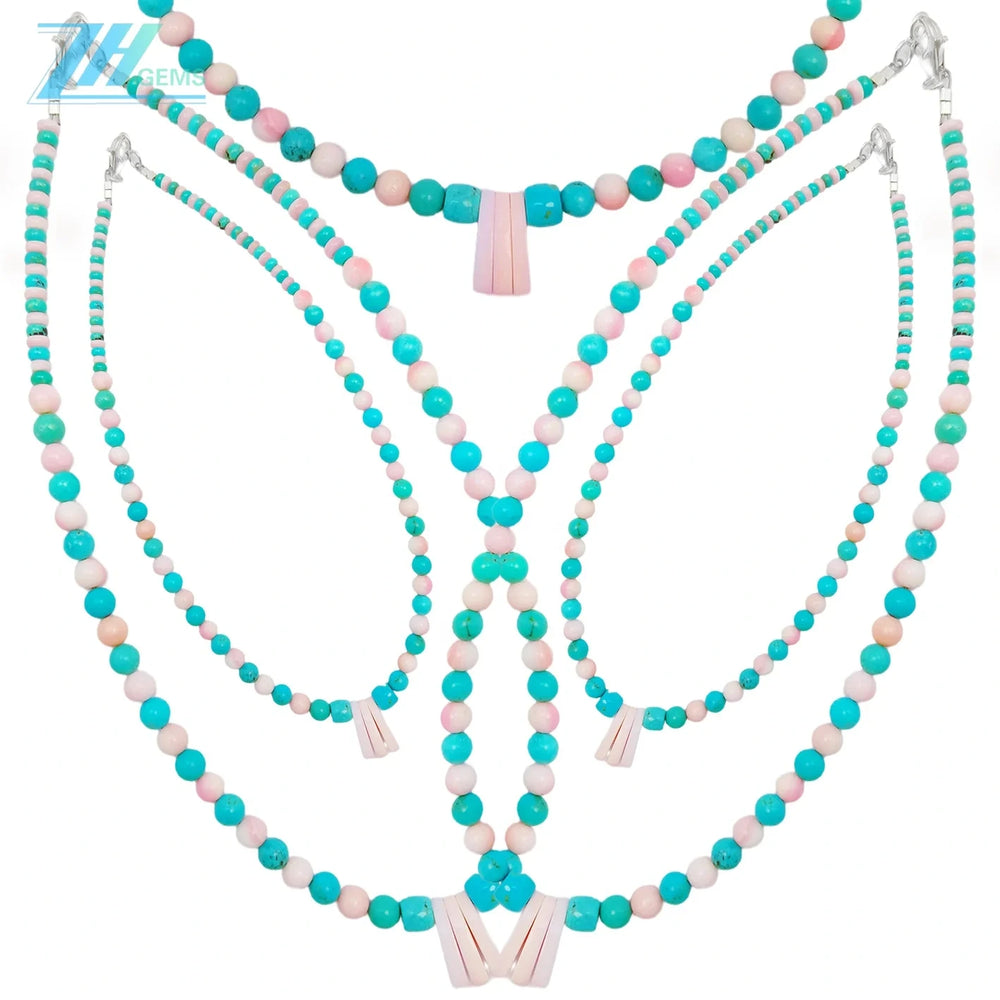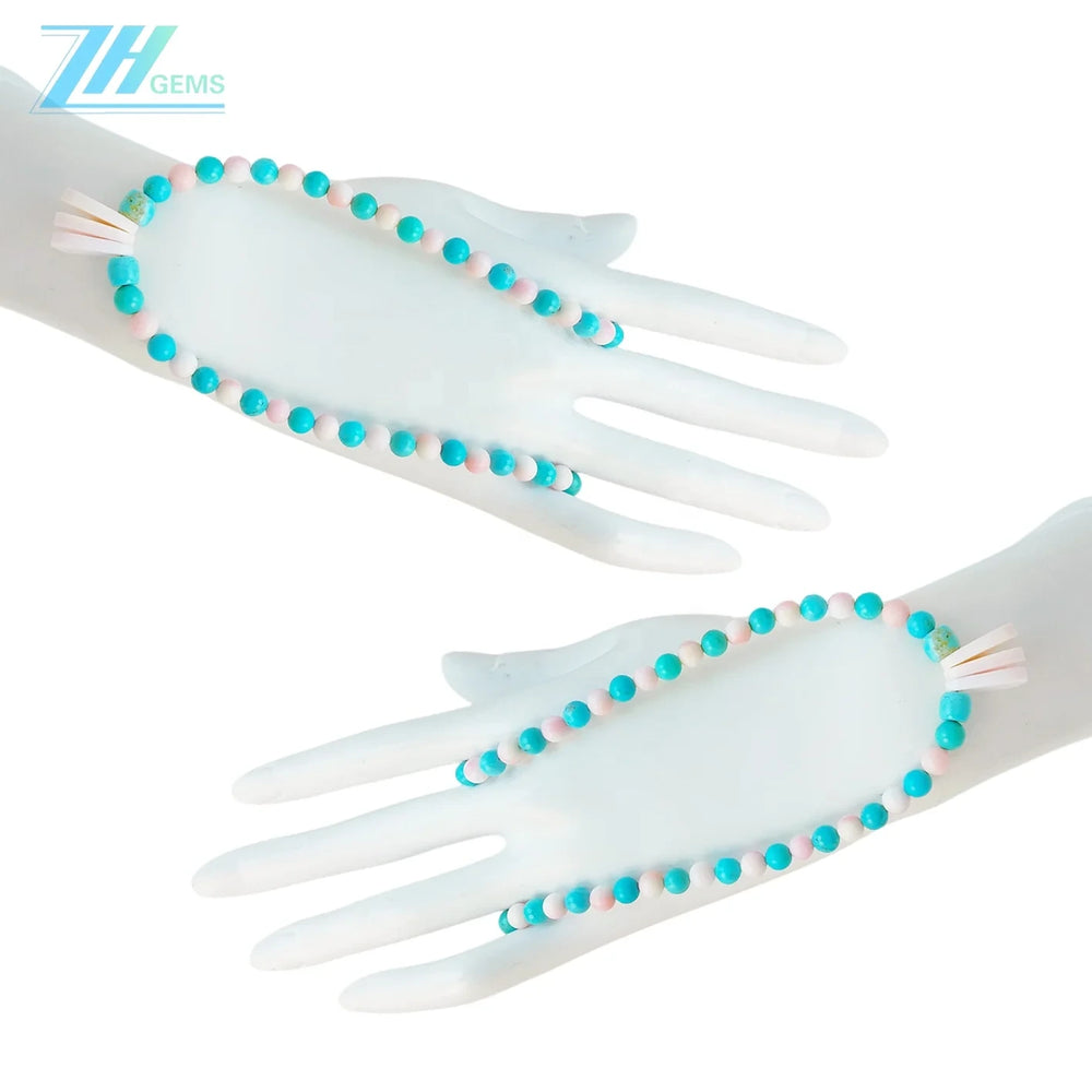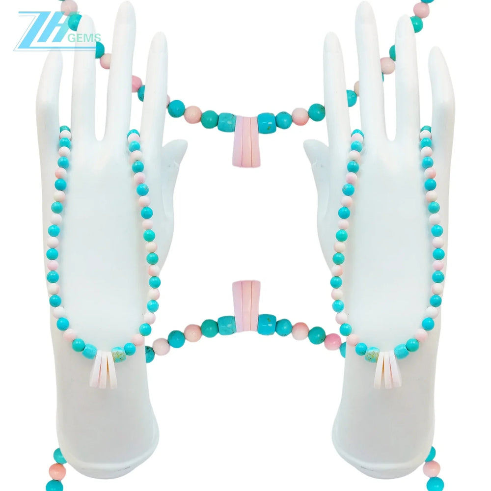 This exquisite necklace showcases the timeless elegance of natural turquoise and pink opal round beads, expertly strung to create a harmonious blend of cool blues and warm pinks. Each 16-inch strand features genuine gemstone beads, celebrated for their unique color variations and natural beauty. The thoughtful pairing of turquoise's calming azure tones with pink opal's gentle rose hues creates a sophisticated aesthetic suitable for both everyday wear and special occasions. Turquoise has long been valued for its protective properties, while pink opal is associated with compassion and emotional healing. This versatile piece complements various styles and skin tones, making it an essential addition to any jewelry collection.