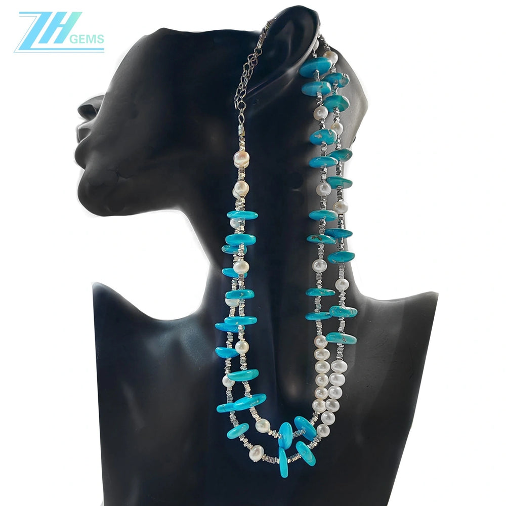 Elevate your jewelry collection with this sophisticated double natural pearl and turquoise necklace, expertly crafted from sterling silver (S925). Each piece combines lustrous freshwater pearls with authentic turquoise gemstones, creating a harmonious blend of timeless elegance and natural beauty. The delicate silver setting showcases the unique characteristics of these precious materials, making it an ideal choice for both everyday wear and special occasions. This versatile necklace complements any wardrobe while celebrating the inherent charm of genuine gemstones.