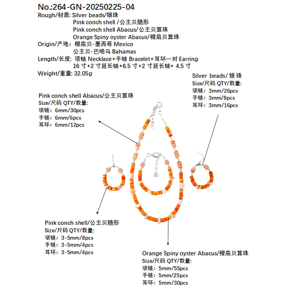 Here comes the charming set! The necklace earrings and bracelet are all made of orange spiny oyster and S925 silver beadswith a unified style fully showing your fashion taste