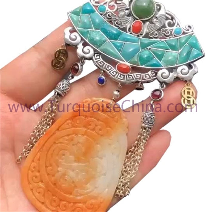 HuangLong jade, revered in Chinese tradition for its imperial significance, meets Tibetan craftsmanship in this exquisite carved ornament. The intricately rendered dragon and cloud motifs symbolize celestial power and prosperity, while the turquoise pendant adds authentic cultural depth. Hand-carved details showcase masterful artistry, making this piece both a spiritual talisman and collector's treasure. Perfect for those who appreciate fine jade work and meaningful cultural artifacts.