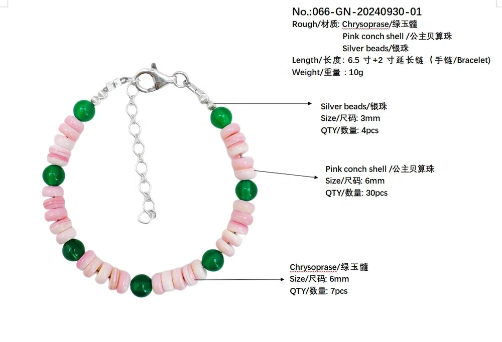 This delicate bracelet combines natural chrysoprase and pink opal gemstones with high-quality S925 silver, creating a refined piece that balances elegance and subtle healing properties. Designed for women who appreciate both style and wellness, its smooth stones promote emotional balance and calm, while the sterling silver ensures durability and a timeless finish. Perfect for everyday wear or as a thoughtful gift, this bracelet enhances any outfit with a touch of natural beauty and expert craftsmanship.