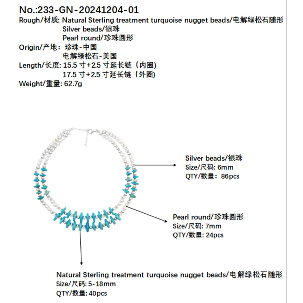 Elevate your jewelry collection with this exquisite natural double turquoise necklace, expertly crafted to showcase the timeless beauty of authentic turquoise and lustrous pearls. Each piece features genuine gemstones set in refined silver, creating a sophisticated accessory that seamlessly transitions from everyday wear to special occasions. The delicate design highlights the unique veining and color variations inherent to natural turquoise, while complementary pearls add an elegant touch of luminosity. Perfect as a winter gift for someone who appreciates fine craftsmanship and the enduring appeal of classic gemstone jewelry. This versatile necklace pairs beautifully with both casual and formal ensembles, making it a treasured addition to any discerning jewelry lover's wardrobe.