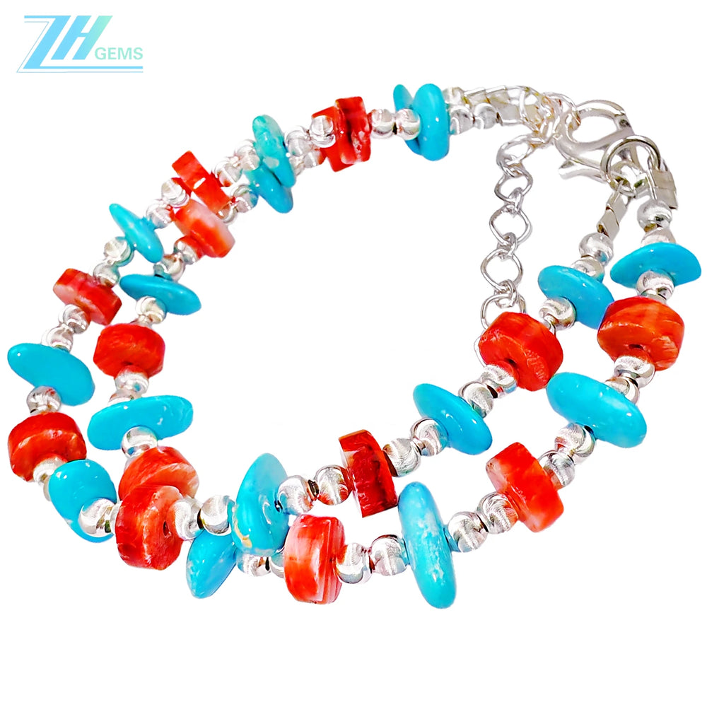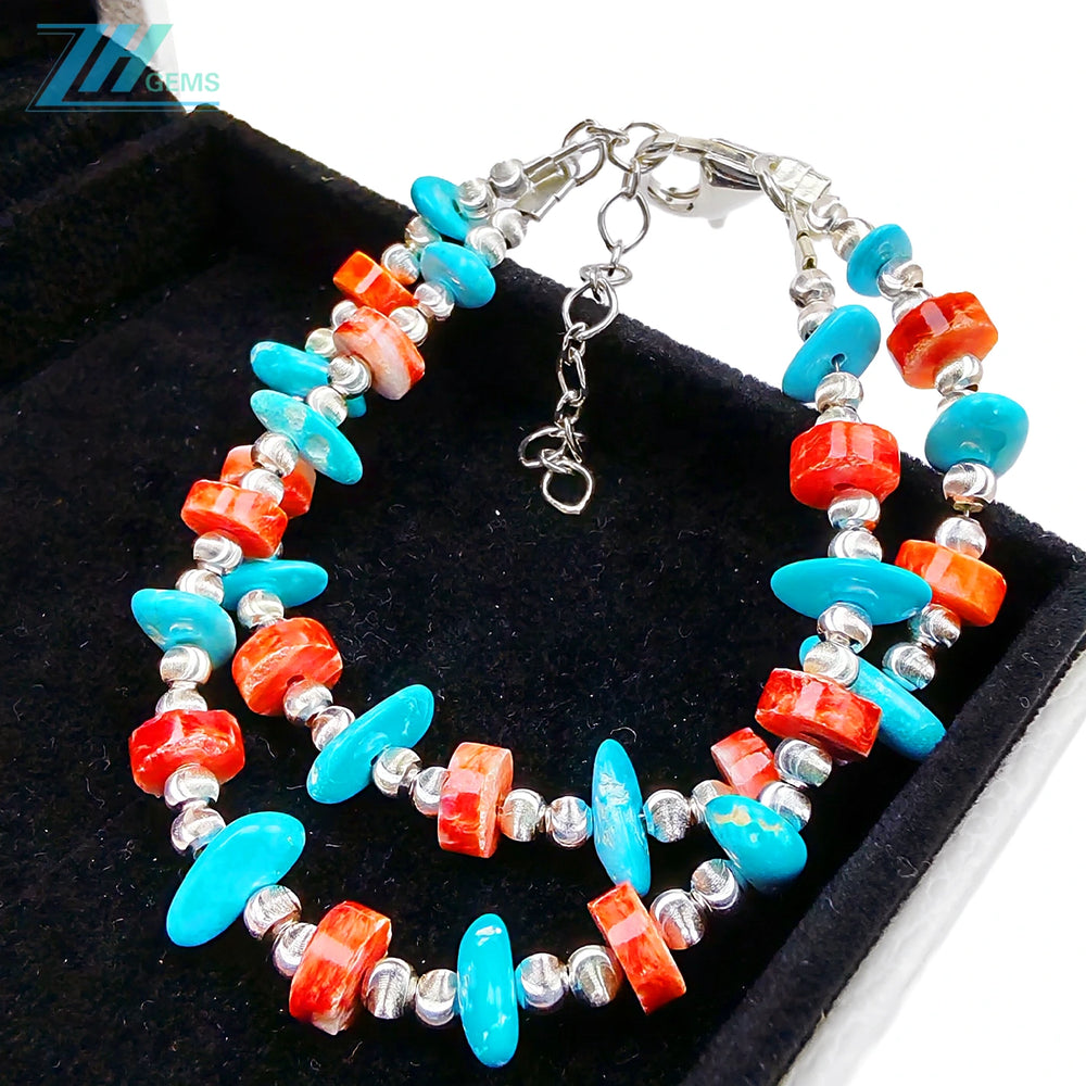 Natural red spiny oyster and Sterling treatment Turquoise meet on the double layer bracelet interweaving a mysterious and charming exotic style on the wrist
