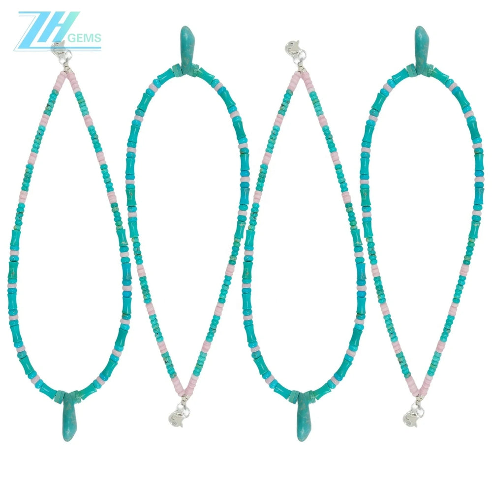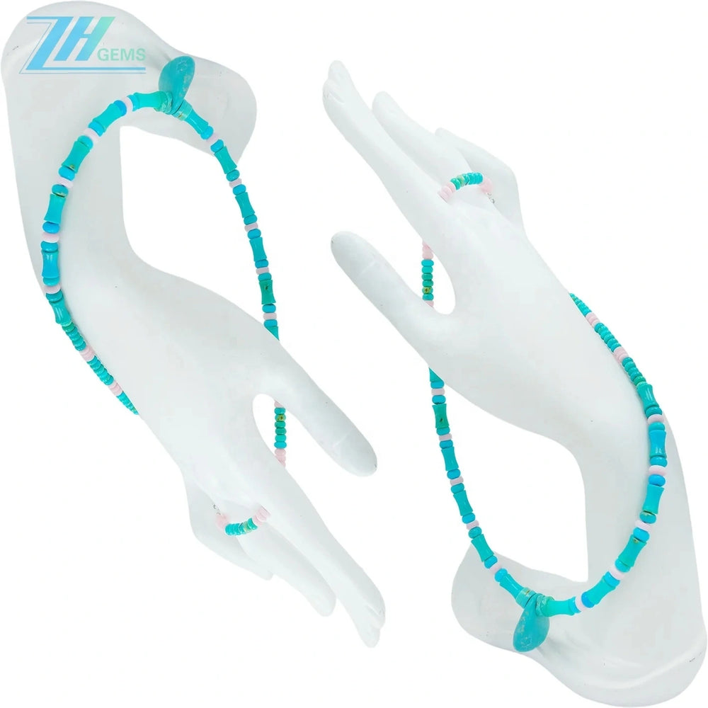 Natural Stabilized Turquoise and Pink Opal Necklace This elegant necklace combines two distinctive gemstones in a harmonious design. Stabilized turquoise brings rich blue-green hues with enhanced durability, while natural pink opal adds soft, warm peachy tones. The contrasting colors create visual interest and versatility, pairing effortlessly with both casual and refined wardrobes. Each piece showcases the unique patterns and variations inherent to natural stones, ensuring no two necklaces are identical. An ideal choice for those seeking meaningful gemstone jewelry with timeless appeal and contemporary style.