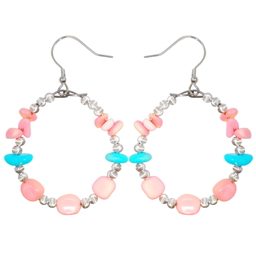 Natural Sterling treatment Turquoise earrings with Pink opal showing feminine beauty flexible earrings sway gracefully