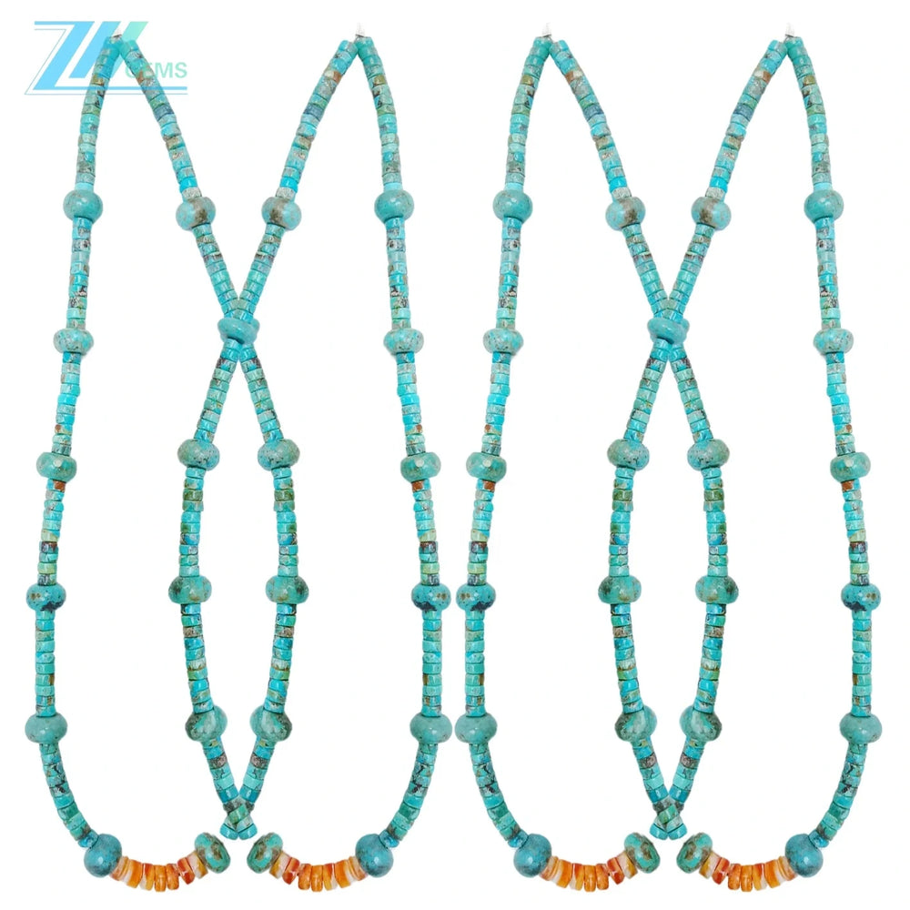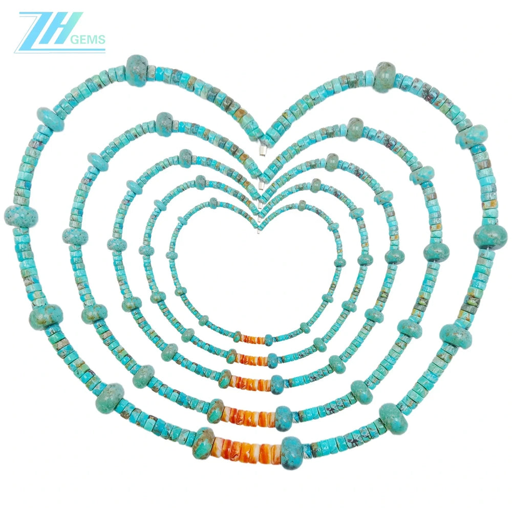 Natural turquoise necklace featuring a harmonious blend of round and heishi beads in striking blue and orange hues. Weighing 17 grams, this piece showcases authentic turquoise craftsmanship with its distinctive color palette that captures both warmth and coolness. The varied bead shapes create visual interest and texture, making it an ideal gift for family members who appreciate genuine gemstone jewelry. Perfect for summer wear, this necklace transitions effortlessly from casual daytime styling to evening occasions, offering versatility without compromising on natural beauty and quality.