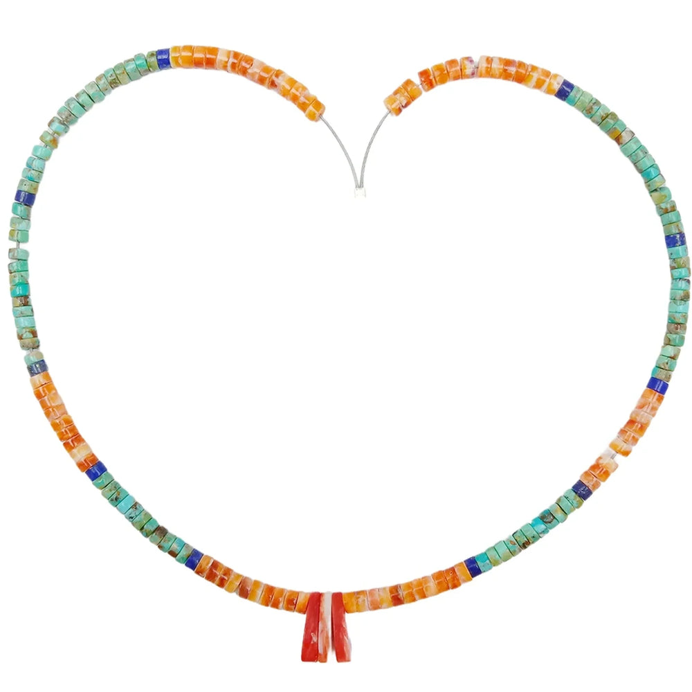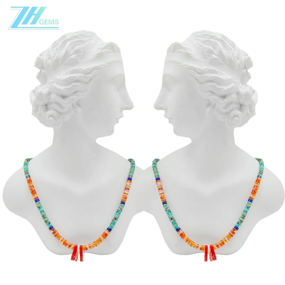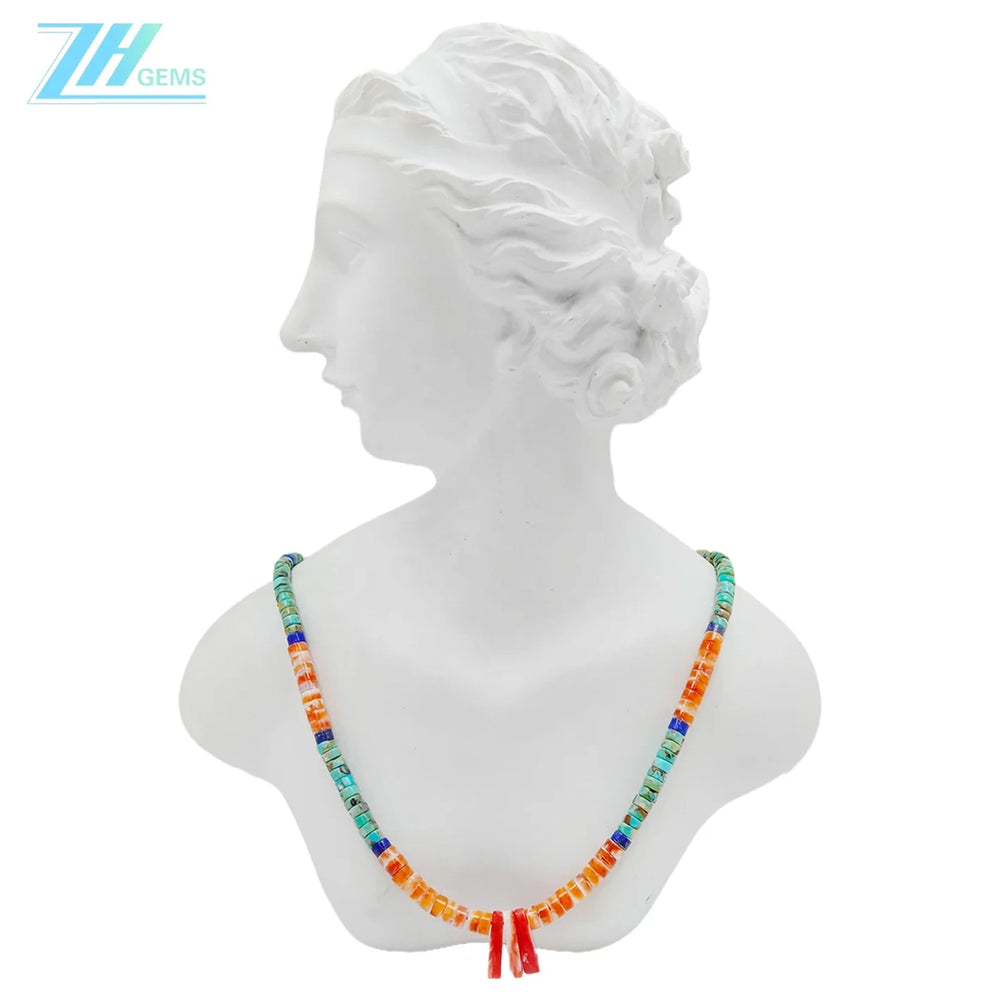 This striking statement necklace combines three captivating gemstones—natural turquoise, spiny oyster shell, and lapis lazuli—each selected for its distinctive character and beauty. The 16-inch design features genuine chip beads that showcase the raw, authentic appeal of these minerals, with their natural variations in color and transparency. Crafted with 925 sterling silver components, this piece offers both durability and timeless elegance. Perfect for those who appreciate genuine gemstone jewelry with geological significance and bohemian sophistication.