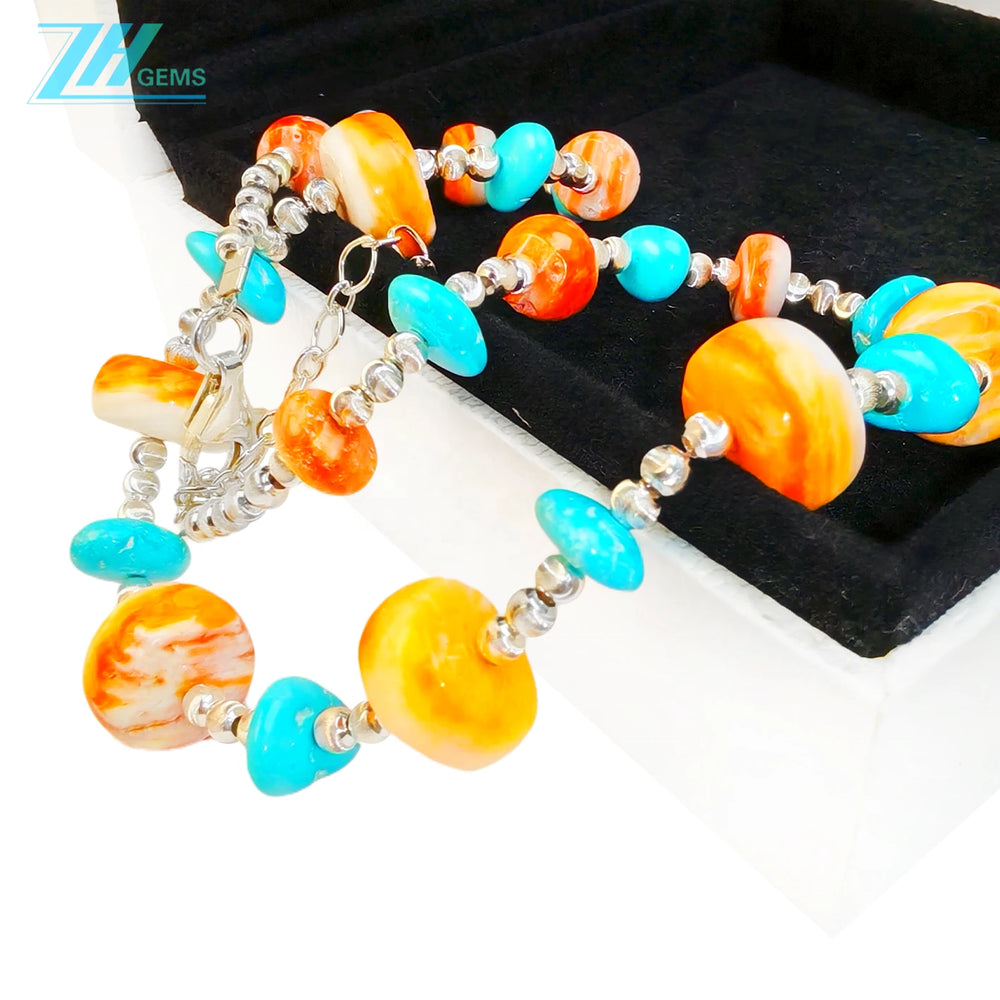 Necklace features S925 silver beads strung with natural Sterling treatment Turquoise and accented with Orange spiny oyster The interwoven colors show unique charm lighting up the neck