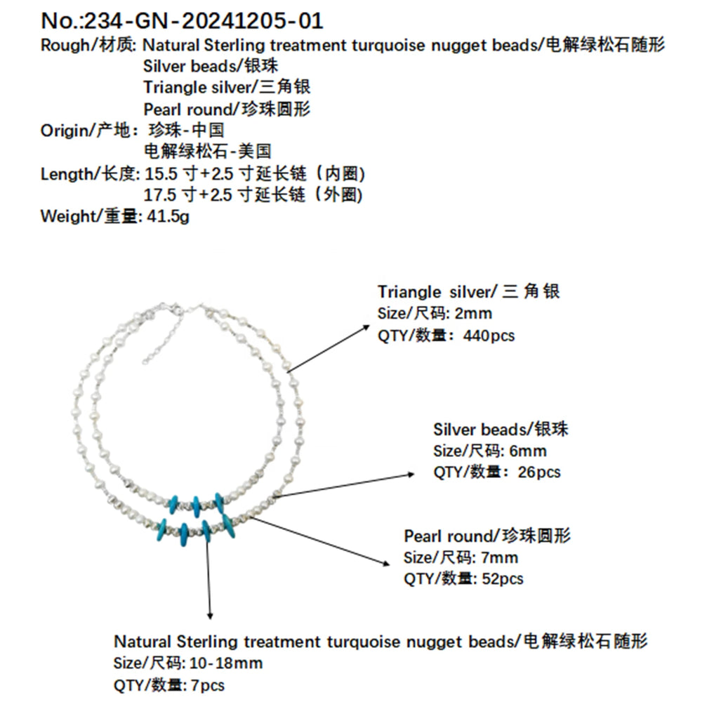 Elevate your collection with this exquisite handcrafted necklace, where lustrous pearls meet authentic turquoise in perfect harmony. Meticulously designed with sterling silver (S925) components, this piece showcases the natural beauty of turquoise's distinctive veining and color variations. The conformal setting ensures each stone sits securely while maintaining its organic character. Ideal for those who appreciate artisanal craftsmanship and timeless elegance, this necklace transitions seamlessly from everyday wear to special occasions. A sophisticated investment in wearable art that celebrates nature's finest gemstones.