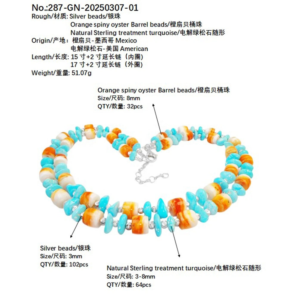 The double layer design combines natural Sterling treatment Turquoise with S925 silver beads with Orange spiny oyster dotted in between showing a unique sense of hierarchy and charm