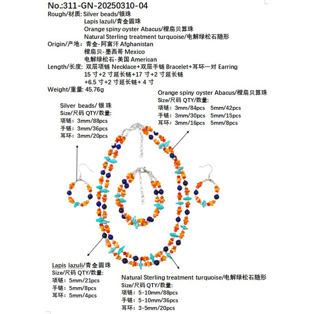 The set made of Sterling treatment Turquoise Lapis Lazuli Orange spiny oyster and S925 silver has a coordinated double layer design It comprehensively interprets elegance and grandeur, making you shine
