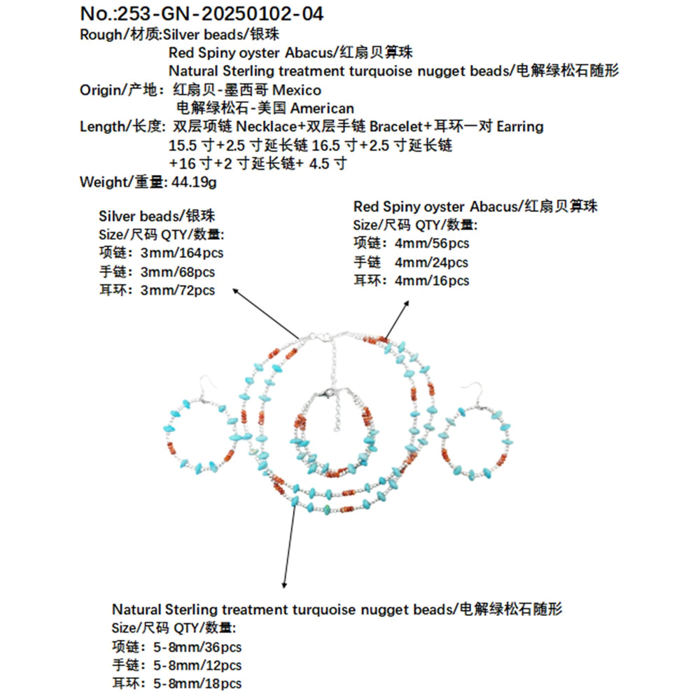 Elevate your collection with this sophisticated turquoise jewelry set, featuring a harmonious pairing of bracelet and necklace. The design showcases premium turquoise stones complemented by striking red spiny oyster accents, creating a distinctive color contrast that captures attention. Each piece is expertly crafted with meticulous attention to detail, offering both versatility and timeless appeal. The conformal construction ensures comfortable wear throughout the day, while the natural variations in stone coloring guarantee authenticity. Perfect for collectors and jewelry enthusiasts seeking pieces that blend traditional craftsmanship with contemporary style.